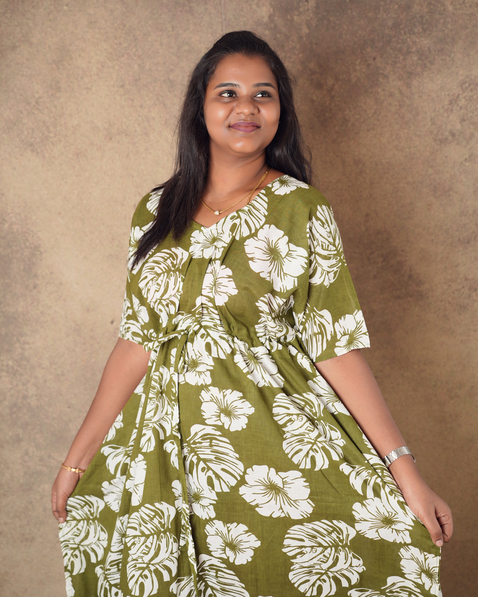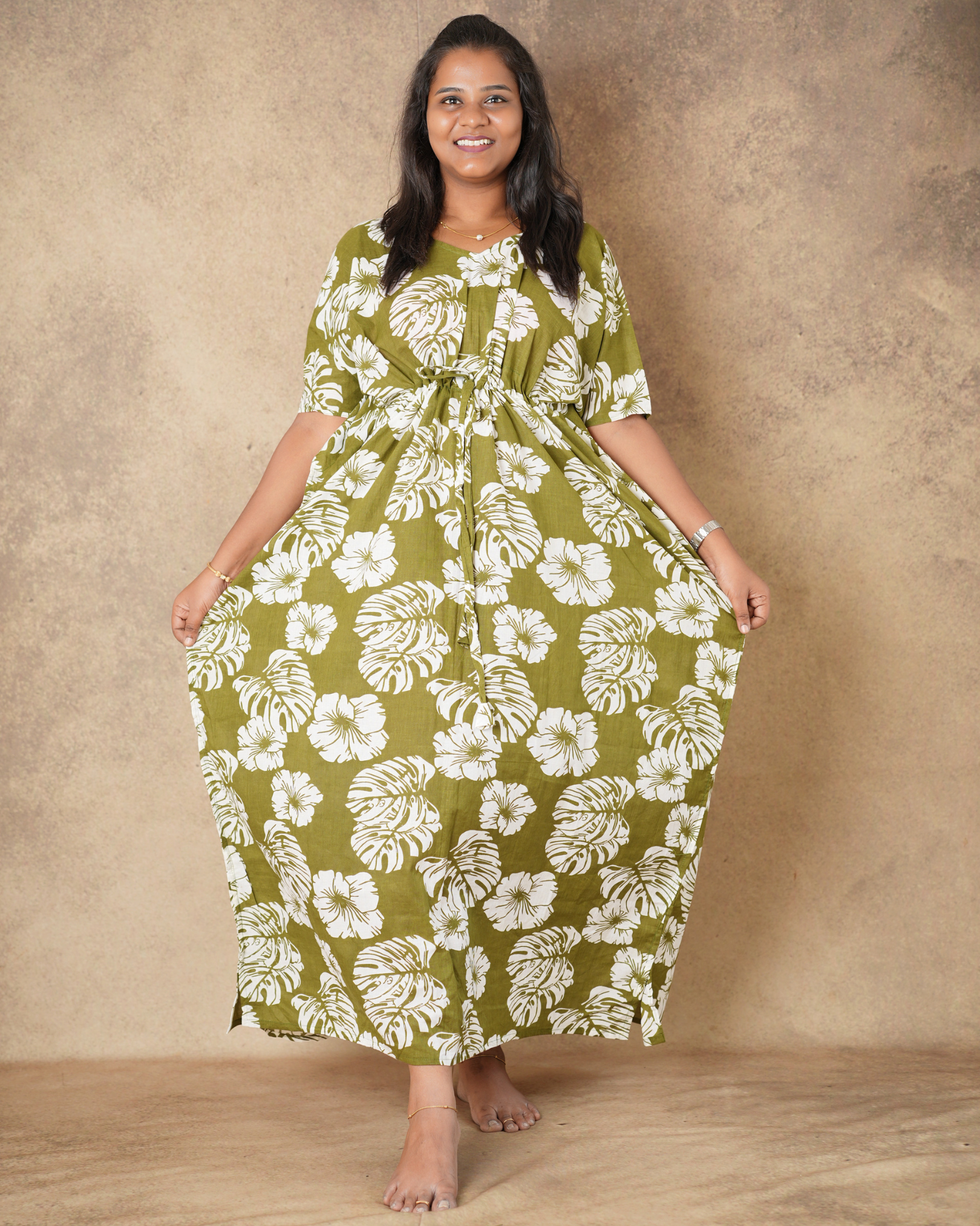 Discover relaxed elegance with this free-size kaftan dress, crafted from pure cotton. Perfect for everyday comfort and effortless style, it features breathable fabric and a graceful silhouette.