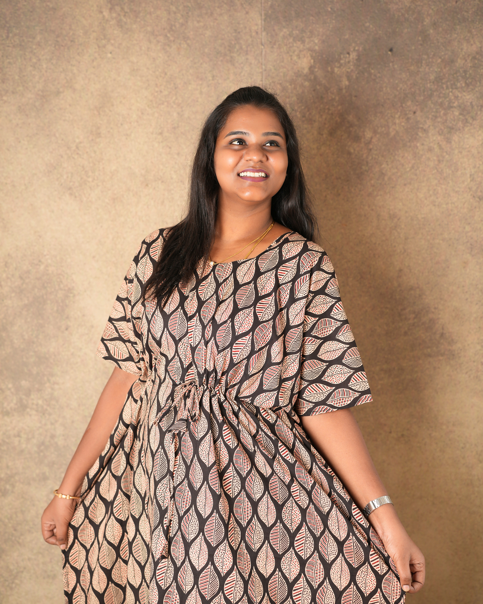 Discover relaxed elegance with this free-size kaftan dress, crafted from pure cotton. Perfect for everyday comfort and effortless style, it features breathable fabric and a graceful silhouette.