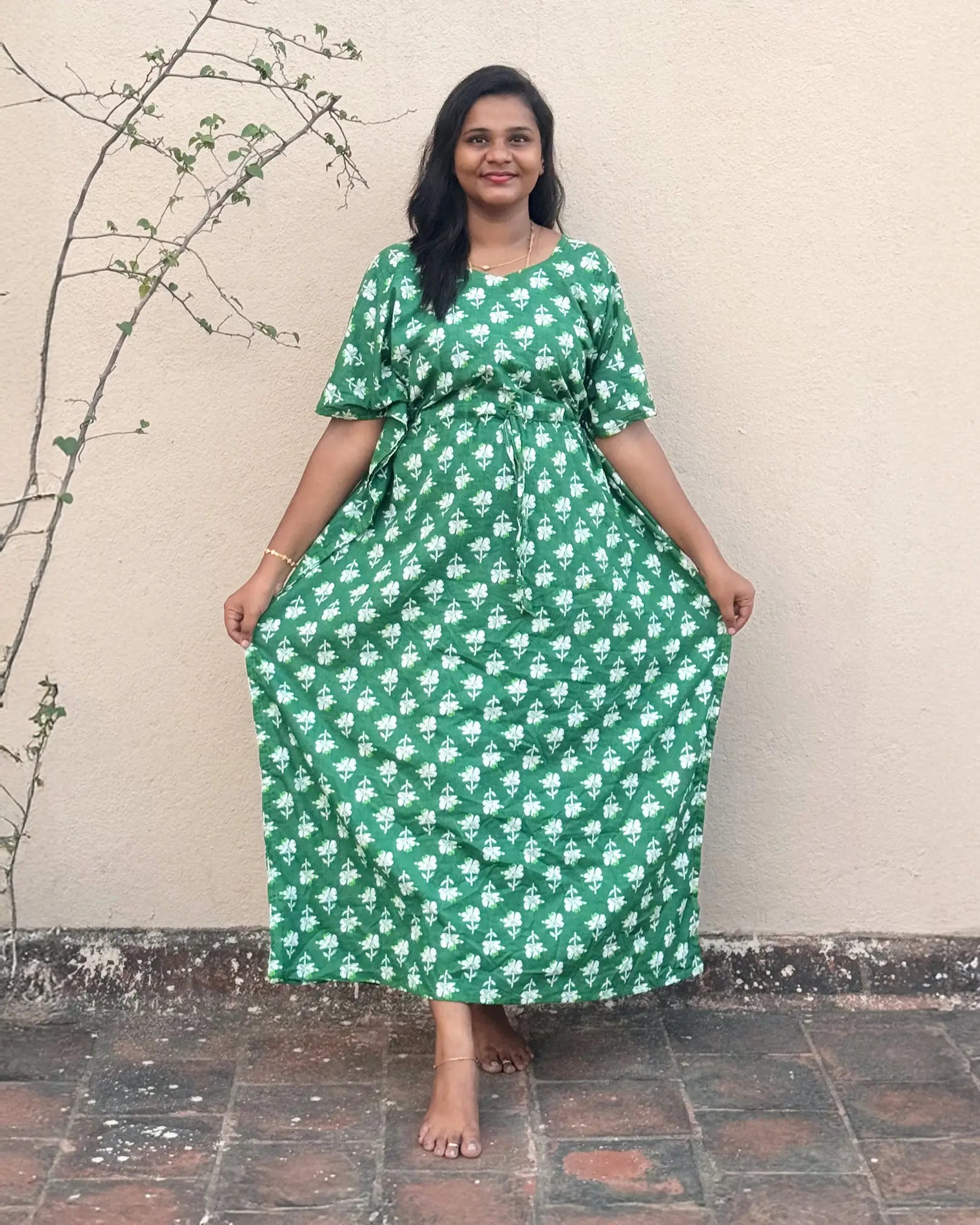 Discover relaxed elegance with this free-size kaftan dress, crafted from pure cotton. Perfect for everyday comfort and effortless style, it features breathable fabric and a graceful silhouette.