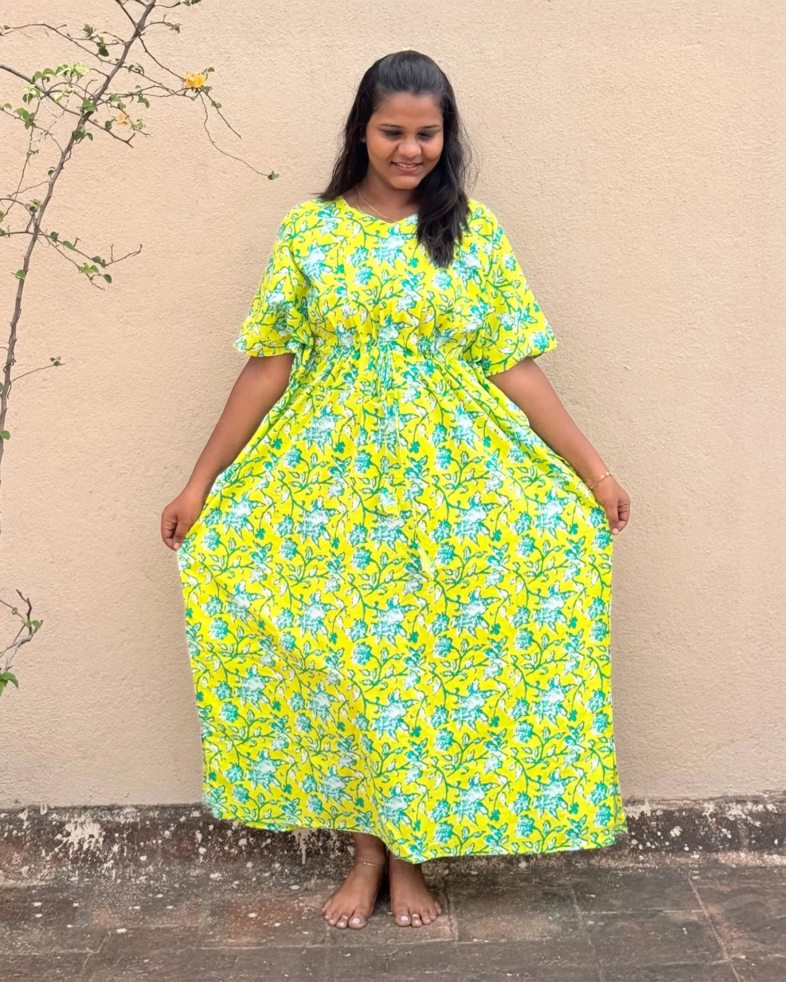 Discover relaxed elegance with this free-size kaftan dress, crafted from pure cotton. Perfect for everyday comfort and effortless style, it features breathable fabric and a graceful silhouette.